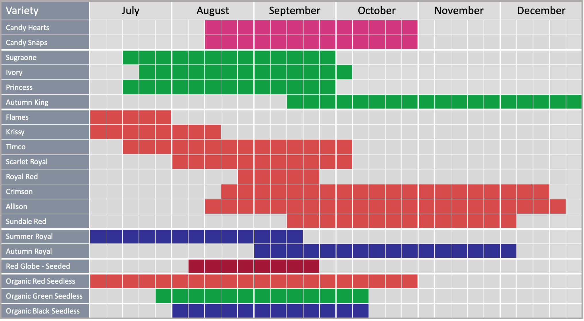 Medium, green, cylindrical-oval, crisp flesh, seedless grapes.